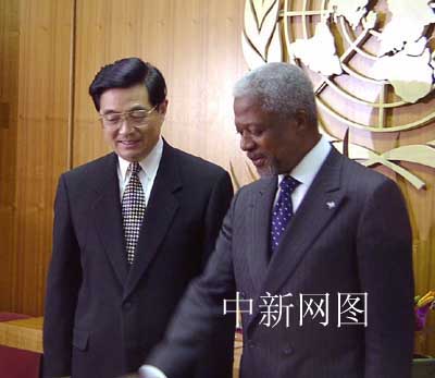 常駐聯合國大使王英凡的陪同下參觀聯合國總部。中新社記者 陳建 攝 中新網聯合國四月二十九日電(記者趙海燕、陳建)今天下午,中國國家副主席胡錦濤在紐約聯合國總部會見聯合國秘書長安南時指出,在當前復雜多變的國際形勢下,聯合國肩負的任務更加艱巨,其作用只能加強,不能削弱;其權威只能維護,不能損害。 胡錦濤說,聯合國成立以來,為解決地區沖突,促進世界和平、合作與發展,做了許多有益的工作,發揮著不可替代的作用。他強調,中國作為安理會常任理事國,將繼續積極參與聯合國事務,支持和配合秘書長的工作。 安南向胡錦濤通報了關于中東、伊拉克等問題的最新進展情況。 關于中東問題,雙方都認為,國際社會應繼續敦促以巴雙方盡早結束以暴制暴的惡性循環,政治解決中東問題是唯一可行的途徑。 在談到伊拉克武器核查問題時,胡錦濤高度評價聯合國為尋求該問題解決所做的努力,他說,世界上大多數國家都希望政治解決伊拉克問題,不希望看到伊拉克問題而引發中東和海灣局勢的進一步復雜和動蕩。 安南高度贊揚中國現代化建設所取得的巨大成就,感謝中國對發展同非洲等發展中國家友好互利合作的一貫重視以及對聯合國工作的堅定支持。 當天下午,胡錦濤還會見了美國前國務卿基辛格博士,雙方就中美關系等問題交換了意見。(完)