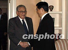 中國國家副主席胡錦濤二十九日下午在下榻的華爾道夫酒店會見了美國前國務卿基辛格。中新社記者 趙海燕 攝