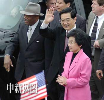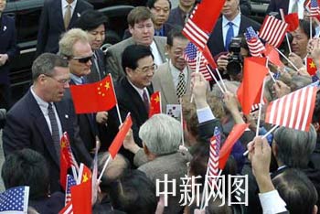 胡錦濤走下專機舷梯后,并沒在美國保安的引導下直接上車,而是向相反方向,走近歡迎人群,高興地與僑胞們握手。中新社 陳建/攝