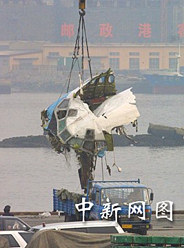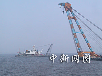 有關部門出動巨型起吊設備打撈五七空難失事客機機頭。中新社記者 王麗南 攝