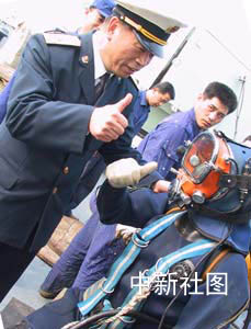 北海艦隊副司令員張巖十一日親臨部隊救撈現場慰問潛水員,充分肯定他們在搜救工作中的表現。目前“五·七”空難遇難者遺體已有七十五具被打撈出水,其中海軍方面打撈了二十四具。(中新社記者 王麗南 攝)