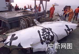 “五-七”空難現場打撈部門今天又打撈出一塊較大的失事飛機殘骸,殘骸上“中國北”三個字清晰可見。(中新社記者王麗南攝)
