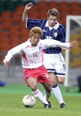 4-1完美屠戮蘇格蘭隊 太極虎韓國熱身也瘋狂(圖) 2002年05月16日 22:21 ![]() 李天秀為韓國隊敲開勝利之門 中新網漢城5月16日消息:在剛剛結束的一場世界杯熱身比賽中,東道主之一的韓國主場發揮神勇,以4-1完美“屠殺”了前德國國家隊主教練福格茨執教的蘇格蘭隊,從而完成了6場熱身不敗。其中李天秀成為場上最耀眼的明星,他的第一個進球堪稱世界級,而安貞煥則梅開二度。韓國隊的另外一個入球由尹晶煥完成,蘇格蘭隊由首次入選國家隊的多比打入一粒安慰性入球。 蘇格蘭由于沖擊世界杯失利,球隊面臨著重組。在福格茨上任后在上個月的第一場國家隊比賽中,就以0-5慘敗給法國隊。在與韓國隊的比賽中,由于多名主力因傷缺陣,因此球隊的實力又打了折扣。 比賽的僵局在第15分鐘就打破,號稱韓國“天才新秀”的李天秀得到后場長傳后,利用嫻熟的個人技術盤過了幾名防守隊員后,又帶球過了門將,在對方最后一名后衛的干擾下,冷靜的將球鏟射入網。 一球領先的韓國隊得勢不饒人,四分鐘之后,李天秀在左邊的射門稍稍偏出。隨后,李榮杓傳球給黃善洪,對方門將在撲了一下后球險些滾入大門。相對而言,蘇格蘭則顯得沒有多少機會。 下半場希丁克用在意大利佩魯賈俱樂部效力的安貞煥換下了老將黃善洪。安貞煥很快就表現出過人的實力,他在第57分鐘一腳有力的遠射將球打進。第67分鐘,同樣替補上場的中場尹晶煥同樣在禁區外抽射,將比分擴大為3比0。第74分鐘,卡首次出場的蘇格蘭前鋒多比接隊友開出的任意球,頭球攻門得手。補時階段,安貞煥以一記精準的挑射再下一城。 在隨后的比賽中,韓國還將與英格蘭和法國隊進行熱身。(宋方燦)