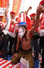 臺北"反臺獨(dú)救臺灣"大游行吁當(dāng)局放棄"臺獨(dú)"黨綱 2002年05月19日 16:30 ![]() 臺灣中國統(tǒng)一聯(lián)盟5月19日發(fā)起“反臺獨(dú)、救臺灣”萬人大游行。民眾以醒目標(biāo)語及旗幟,表達(dá)支持一個中國、反對“臺獨(dú)”的立場。(“中央社”圖) ![]() 臺灣中國統(tǒng)一聯(lián)盟5月19日發(fā)起“反臺獨(dú)、救臺灣”萬人大游行,在“美國在臺協(xié)會”門前,由一名面戴面具、扮作美國總統(tǒng)布什的男子跪地磕頭,就美國干涉臺海事務(wù)向臺灣民眾道歉。(“中央社”圖) 中新社香港五月十九日電 臺北消息:中國統(tǒng)一聯(lián)盟今天發(fā)起“五一九反臺獨(dú)、救臺灣大游行”,數(shù)千臺灣民眾身穿“One China”的紅上衣及紅帽子,高呼“反臺獨(dú)、救臺灣”,以表達(dá)他們支持一個中國、反對臺獨(dú)的立場。 據(jù)“中央社”報導(dǎo),游行隊伍于下午在臺北“中正紀(jì)念堂”出發(fā),民眾在經(jīng)過美國在臺協(xié)會時高呼“ROT(臺灣共和國),爛!爛!爛!One China,贊!贊!贊!”的口號,部分情緒激動的民眾并向美國在臺協(xié)會投擲雞蛋。 游行活動總領(lǐng)隊、中國統(tǒng)一聯(lián)盟主席王津平,日前在獨(dú)派人士的“臺灣正名”游行活動中遭到攻擊而受傷,今天他在游行前發(fā)表演講,抨擊臺灣當(dāng)局兩年來,在民進(jìn)黨臺獨(dú)黨綱箝制下,導(dǎo)致兩岸關(guān)系緊張、經(jīng)濟(jì)嚴(yán)重衰退、社會混亂不安。 王津平說,今天“反臺獨(dú)、救臺灣”大游行的主要訴求,就是呼吁當(dāng)局撤除臺獨(dú)黨綱,遵守“一個中國”,回歸“九二共識”。 中新網(wǎng)香港5月19日消息:臺北訊,臺灣中國統(tǒng)一聯(lián)盟今天號召發(fā)起數(shù)十個島內(nèi)“在野”政黨次級團(tuán)體、反“臺獨(dú)”的民眾、車隊共同參與的“519反‘臺獨(dú)’、救臺灣萬人大游行”。 此次大游行由中國統(tǒng)一聯(lián)盟主席王津平擔(dān)任總領(lǐng)隊。日前為反制“臺獨(dú)”集團(tuán)的所謂“臺灣‘正名’游行”而遭暴力攻擊并受傷的王津平,在游行出發(fā)前發(fā)表演說指出,陳水扁上臺兩年以來,都因為“臺獨(dú)”黨綱箝制當(dāng)局政策發(fā)展,導(dǎo)致兩岸關(guān)系緊張、島內(nèi)嚴(yán)重經(jīng)濟(jì)衰退、社會混亂。 此次游行的主要訴求,就是呼吁陳水扁當(dāng)局及民進(jìn)黨撤除“臺獨(dú)”黨綱,遵守“一中原則”,回歸“九二共識”,以正式渠道恢復(fù)兩岸談判;立即三通,加速經(jīng)濟(jì)互補(bǔ)互利。 此外,游行隊伍向當(dāng)局喊出“反軍購、要福利”、“要顧三通,不要神盾”等口號。 據(jù)悉,游行隊伍也以踐踏美國國旗的方式,表達(dá)對美國介入臺海事務(wù)的強(qiáng)烈不滿。 另外,中國統(tǒng)一聯(lián)盟今晚將在舉辦“中國人團(tuán)結(jié)之夜”音樂會,呼應(yīng)白天的游行主題。 相關(guān)報道:臺灣中國統(tǒng)一聯(lián)盟控告李登輝及"臺獨(dú)"分子施暴 相關(guān)報道:董建華會見臺灣"中國統(tǒng)一聯(lián)盟一國兩制參訪團(tuán)" 相關(guān)報道:臺灣中國統(tǒng)一聯(lián)盟訪港考察"一國兩制"實施情況 相關(guān)報道:臺灣中國統(tǒng)一聯(lián)盟抗議海外"臺獨(dú)"組織在臺興風(fēng)作浪 相關(guān)報道:臺灣“中國統(tǒng)一聯(lián)盟”抗議日相參拜靖國神社 相關(guān)報道:臺灣中國統(tǒng)一聯(lián)盟等十多個團(tuán)體抗議達(dá)賴訪臺 相關(guān)報道:臺灣中國統(tǒng)一聯(lián)盟座談會指臺灣沒理由抗拒“一國兩制”