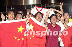 澳門科大學生23日晚守候在中國國家足球隊下榻的東方文華酒店,高舉中國國旗歡迎中國國腳的到來。中新社記者 李剛 攝
