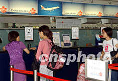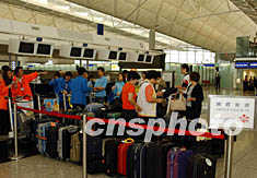 五月二十六日上午,香港國際機場赴臺灣的所有航營運正常。圖為“華航”柜臺均與往常一樣,次序井然。中新社記者 潘索菲 攝