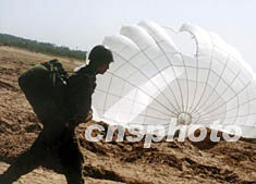 中國某空降部隊新兵,在五月的驕陽下進行跳傘訓練,一位新兵收傘后急速通過同伴的降點準備下一次跳傘。因為跳點準確、收傘快速是他們當前訓練的主要目標。王麗南 攝