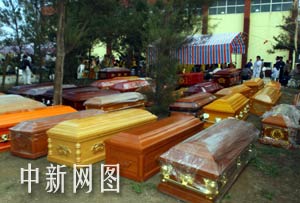 擺放在臺灣澎湖馬公空軍基地中的盛殮遇難者遺體的棺材。5月26日,臺灣澎湖馬公空軍基地中的遇難乘客尸體辨認中心排列了眾多棺材。中新社傳真任晨鳴攝