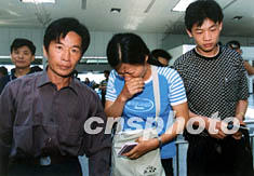 五月二十七日,“華航”空難罹難者林少清(女)的父親林國斌(左)、姐姐林少娟(中)、哥林少偉(右)在福建省臺辦官員的幫助下,首批登機赴臺奔喪。陳勇 攝
