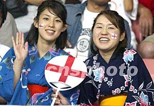 世界杯足球賽八分之一決賽十五日在日本新瀉開賽,英格蘭隊(白衣)以三比零大勝丹麥而進入八強。圖為身穿和服的日本女球迷為英格蘭隊助威。作者:毛建軍