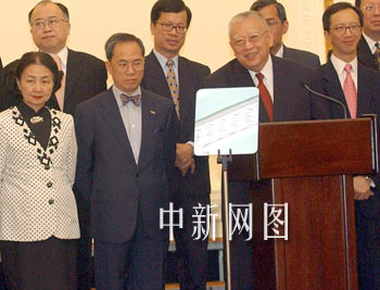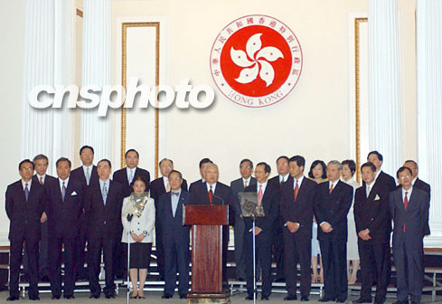 董建華宣布“新內閣”名單。香港特首董建華6月24日在香港禮賓府宣布二十一名“新內閣”成員名單。中新社傳真洪少葵攝