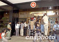 6月24日香港特首董建華宣布了新一屆“內(nèi)閣”名單后,各位高官在政府總部大堂依次會見傳媒,眾多記者在政府總部大堂等待。中新社傳真 任晨鳴 攝