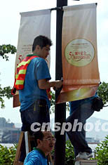 香港會(huì)議展覽中心將于7月1日舉行第二屆特區(qū)行政長(zhǎng)官就職典禮,及慶祝香港回歸祖國(guó)五周年活動(dòng),6月28日會(huì)展中心一帶高掛慶祝標(biāo)語(yǔ),迎接特區(qū)成立五周年。洪少葵 攝