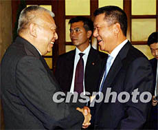六月三十日,香港特首董建華在香港特區政府禮賓府舉行香港特別行政區成立五周年慶祝宴會。圖為董建華與澳門特首何厚鏵握手。潘索菲 攝