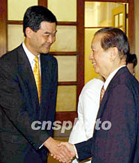 六月三十日,國務(wù)院副總理錢其琛在香港出席特區(qū)政府成立五周年慶祝晚宴時(shí)與行政會(huì)議召集人梁振英握手。潘索菲 攝