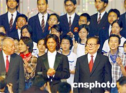 7月1日上午,香港隆重舉行慶祝香港回歸祖國五周年大會暨特區(qū)第二屆政府就職典禮,國家主席江澤民登臺感謝全體演出人員。中新社傳真任晨鳴攝