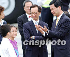 香港行政會議召集人梁振英(右)、財政司長梁錦松等香港高官,7月1日在香港國際機場為國家主席江澤民送行前,與為江主席獻花的學童問好。中新社圖 洪少葵 攝