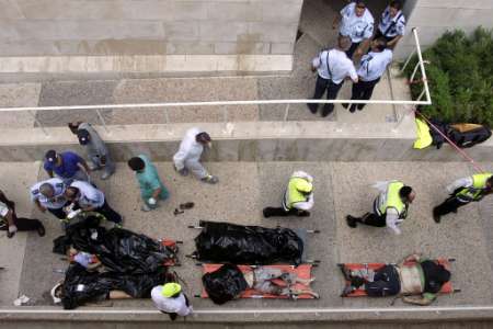 耶路撒冷大學(xué)爆炸六個外國人死亡 中國學(xué)生無恙 2002年08月01日 06:28 ![]() 中新網(wǎng)北京8月1日消息:以色列官員說,在耶路撒冷希伯來大學(xué)炸彈爆炸中喪生的七個人,有六個是外國國籍,包括最少一名美國及一名法國人。 事件中還有九十多人受傷。新華社說,有十多名中國留學(xué)生在這間大學(xué)就讀,他們?nèi)堪踩?/p> 本次是耶路撒冷在24小時內(nèi)發(fā)生的第二宗炸彈襲擊。伊斯蘭激進組織哈馬斯已承認(rèn)負(fù)責(zé)。 耶路撒冷希伯來大學(xué)餐廳發(fā)生爆炸致7死85傷 中新網(wǎng)北京7月31日消息:據(jù)美聯(lián)社報道,耶路撒冷東部希伯來大學(xué)的一個餐廳31日午餐時間發(fā)生爆炸,造成7人死亡,85人受傷,其中14人重傷。 巴勒斯坦激進組織伊斯蘭抵抗運動哈馬斯宣布對此次爆炸事件負(fù)責(zé),并稱這是對以色列23日轟炸加沙居民樓進行的報復(fù)。 雖然以色列的各大學(xué)目前均已放假,但發(fā)生爆炸時仍有許多留校學(xué)生正在咖啡廳用午餐。 事發(fā)后,新華社記者與在該大學(xué)區(qū)讀書的幾名中國留學(xué)生取得了聯(lián)系。據(jù)他們介紹,由于學(xué)校放假,中國學(xué)生均離開了學(xué)校,在爆炸中沒有中國學(xué)生受傷。目前有十幾名中國留學(xué)生在該大學(xué)區(qū)讀書。 死傷的人員中大部分為18-30歲的學(xué)生,其中許多為外國學(xué)生。這是自以巴沖突爆發(fā)以來,在以色列校園內(nèi)發(fā)生的首起爆炸襲擊事件。 巴勒斯坦民族權(quán)利機構(gòu)事后發(fā)表聲明譴責(zé)爆炸事件。以色列總理沙龍取消了當(dāng)天的所有日程安排,預(yù)計以色列內(nèi)閣將召開會議。 美國總統(tǒng)布什強烈譴責(zé)本次襲擊。他呼吁巴勒斯坦民族權(quán)利機構(gòu)致力制止恐怖主義,并強調(diào)美國不會放棄推動中東實現(xiàn)和平。 在昨日,巴勒斯坦激進份子,在耶路撒冷市中心,發(fā)動自殺式襲擊,造成一死七傷。