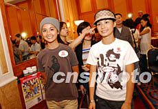 香港偶像組合Twins,8月5日出席新城臺慶記者會,蔡綽妍【左】頭戴冷帽引人注目。 洪少葵 攝