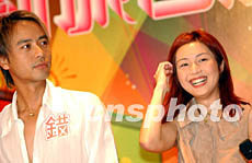 即將舉辦個(gè)人演唱會(huì)的香港歌星楊千樺(右),8月5日出席新城電臺臺慶記者會(huì)時(shí)與李克勤玩游戲七情上臉。 洪少葵 攝