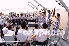 中國海軍駐上海某部戰士演出隊,冒著八月的酷暑在掃雷艇上為水兵表演文藝節目。作者:張海峰
