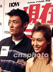 香港明星朱茵和余文樂于八月二十八日在香港宣傳其合演的音樂網劇。張志偉 攝