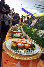 四川樂山國際大佛節(jié)旅游“美食周”九月一拉開帷幕。在為期一周的活動(dòng)中,將舉行民間飲食絕活表演、展銷,“川菜十大名菜”和樂山“十佳風(fēng)味小吃”評(píng)比。圖為來樂山采訪的眾媒體記者聚焦精美菜肴。 作者:陳雯