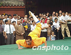 少林派登場的十二個小和尚,最小的只有九歲,最大的不過二十三歲。腿上開棍、銀槍刺喉、背上開磚讓人對少林硬氣功嘆為觀止。除此以外,小和尚還逐一演繹少林的刀、槍、棍、鞭、劍、拳,把少林絕學的魅力發揮到極致。