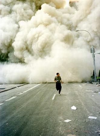 2001年9月11日,紐約世貿中心大樓倒塌后,一男子沿百老匯大街奔跑逃命,身后是大樓倒塌引起的煙塵。(春風)