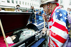 一名美國(guó)人制作了一具裝有本·拉登“尸體”的棺木,十一日在紐約世貿(mào)中心前的百老匯大街上示眾,以此紀(jì)念“9.11”事件一周年。作者:王瑤