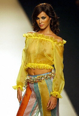9月11日,西班牙馬德理舉行2003年春夏時(shí)裝表演,圖為一位模特展示透明裝。
