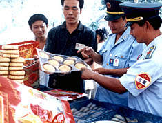 中秋節前夕,山東棗莊的工商人員在集市上檢查月餅質量,以保證消費者在中秋節吃到質量信得過的月餅。 作者:高貴軍