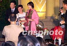 第十六屆澳門國際音樂節九日晚在澳門玫瑰堂前地舉行“蔡琴、費玉清玫瑰之約”藝術家之約活動,許多蔡琴的歌迷紛紛走上臨時舞臺向她獻上玫瑰花并輿她合影。李剛 攝