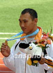中國(guó)選手吳濤十三日在釜山綜合體育場(chǎng)舉行的男子鐵餅決賽中奪得金牌。圖為吳濤在領(lǐng)獎(jiǎng)臺(tái)上。作者:武仲林