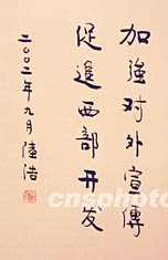 甘肅省省長(zhǎng)陸浩為中新社成立五十周年題詞:加強(qiáng)對(duì)外宣傳,促進(jìn)西部開發(fā)。