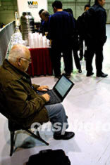 22日,一名美國記者在芝加哥奧黑爾機場休息室里,搶發中國國家主席江澤民訪問美國飛抵芝加哥的現場新聞。作者:王瑤