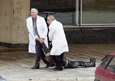 10月24日,在莫斯科軸承廠文化宮劫持?jǐn)?shù)百名人質(zhì)的車臣武裝分子槍殺一名女性人質(zhì)。圖為兩名醫(yī)務(wù)人員移走被車臣武裝分子槍殺的女子尸體。