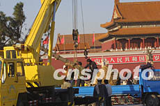 為迎接“十六大”的召開,天安門廣場上的園林工人再次為擺花而忙碌。二十八日,耐寒的松樹被吊車運(yùn)抵廣場,大批鮮花將再現(xiàn)繁花似錦的景觀。作者:史利