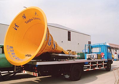它是高技術的產品--氣動喇叭。中國的這種氣動喇叭是世界水平最高的。它能讓12公里外的聽眾清楚地聽到廣播,它巨大的功率使它播音時根本沒有人敢站在喇叭前。它是作為世界唯一的機場消霧喇叭的身份來參加航展的。據介紹它只要吼叫起來,甚至機場跑道上的霧都會消散。