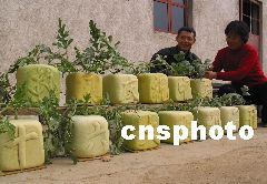 沂蒙山區(qū)費(fèi)縣大田鄉(xiāng)黃土莊村青年農(nóng)民田榮芳是當(dāng)?shù)剡h(yuǎn)近聞名的“沂蒙山西瓜王”,在十六大召開前他經(jīng)過反復(fù)試驗(yàn),終于培育出了長有“熱烈慶祝中國共產(chǎn)黨十六大勝利召開”字樣的16個(gè)正方形西瓜,每個(gè)重約16斤左右。代表了沂蒙老區(qū)農(nóng)民心向黨中央的、盼望著黨的十六大早日召開熱切心情。田榮芳高興地說:“俺正準(zhǔn)備把西瓜運(yùn)往北京,獻(xiàn)給黨中央、獻(xiàn)給十六大!”王樹芳、潘振宇 攝