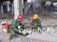 爆破前施工人員正在檢測爆破用的塑料引爆管和雷管。
