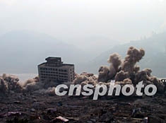 三峽庫區迄今為止最大規模爆破,四日上午十時五十分在重慶奉節實施。這座具有詩城美譽的千年歷史文化名城傾刻間灰飛煙滅,明年三峽庫區二期蓄水后這里將成為一片汪洋。前來參加爆破實施的中國國務院三峽建設委員會副主任、重慶市副市長甘宇平成為了媒體采訪的焦點人物,他表示此次爆破意味著三峽庫區建筑物爆破工作基本結束。作者:鄒輝