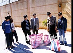 一個在深圳沙頭角某住宅樓利用魚槍發射鋼絲在深港兩地搭起一條走私手機的“空中運輸線”、企圖大肆走私手機的犯罪團伙,六日被深圳海關緝私警察全部抓獲,繳獲走私進口手機一百六十三部、手機電池九十六個、耳機一千二百個。圖為被抓獲的走私分子。作者:張曹