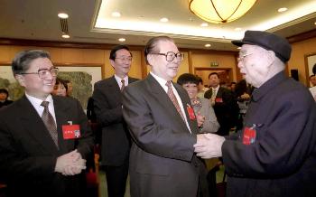 江澤民今天上午參加上海代表團討論與99歲高齡的特邀代表夏征農親切交談 新華社記者 鞠鵬 攝