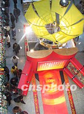 在十六大召開期間,北京圖書大廈設(shè)立了十五大以來中國經(jīng)濟建設(shè)成就圖片展覽,吸引了大批北京市民參觀。圖為設(shè)計別致的展臺。作者:廖文靜