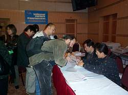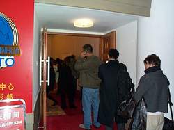 央視國際播發(fā)專稿報道說,今天下午,記者在十六大新聞中心外國記者接待處見到,等候領(lǐng)取新常委見面會請柬的外國記者排起了長長的隊伍,一直延伸到接待處的大門口外。