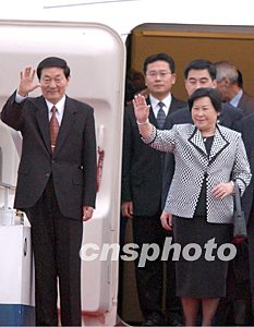 中國國務院總理朱镕基和夫人勞安,11月18日下午乘坐專機抵達香港參加“第十六屆世界會計師大會”。中新社傳真 任晨鳴 攝