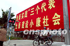 中共十六大閉幕不久,海南省?谑袊d路旁十八日掛出“全面實踐‘三個代表’全面建設小康社會”的巨幅宣傳標語牌。作者:鄒憲