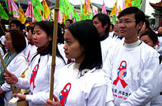 十一月二十四日,一百多位來自昆明各高等院校的青年志愿者從昆明城郊四個方位出發,最后在昆明金馬碧雞廣場會聚。他們沿途宣傳預防愛滋病的知識,以減少大眾對愛滋病感染者和病人的偏見和歧視。作者:納家驊