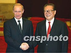 中國國家主席江澤民二日在北京人民大會堂舉行儀式,歡迎來訪的俄羅斯總統普京。作者:毛建軍